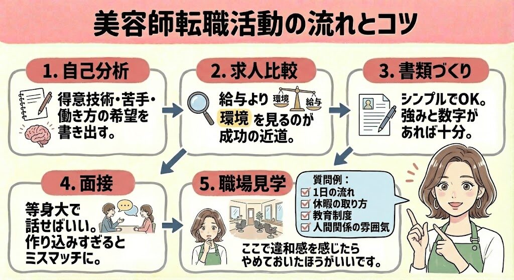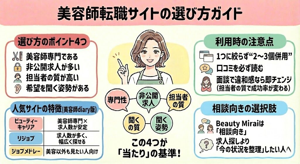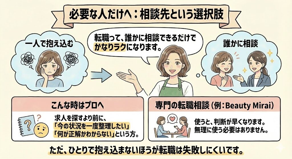 美容師専門の転職相談(例:Beauty Mirai)を使うと、判断が早くなります。